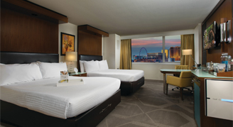 Immerse yourself in the glitz of The Strip. Never miss a moment of the action, with sweeping views of iconic Las Vegas landmarks dazzling the skyline just outside your window. This sanctuary features Mirage Serta Perfect Sleeper® Pillow Top Mattress, 42" LCD TV, JBL Horizon Bluetooth Speaker, and all the in-room comforts necessary for your ultimate Las Vegas stay.