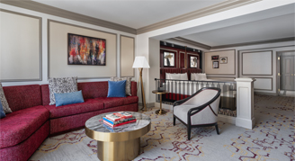 Featuring a contemporary, fresh design inspired by the traditional ornate costumes of the Venetian Carnival, this newly remodeled suite comes complete with a pillow-top king bed, a sunken living room, a complimentary guest mini-fridge and a dining table for your in-suite dining indulgences. Unwind as you relax in the all-marble expansive bathroom that features an oversized Roman tub, a separate glass-enclosed shower, a double-sink vanity along with a separate make-up mirror and vanity.