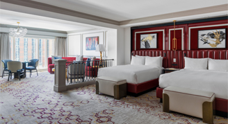 Featuring a contemporary, fresh design inspired by the traditional ornate costumes of the Venetian Carnival, this newly remodeled suite comes complete with two pillow-top queen beds, a sunken living room, a complimentary guest mini-fridge and a dining table for your in-suite dining indulgences. Unwind as you relax in the all-marble expansive bathroom that features an oversized Roman tub, a separate glass-enclosed shower, a double-sink vanity along with a separate make-up mirror and vanity.
