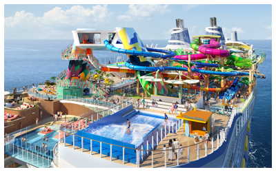 - Thrill Island: Royal Caribbean’s “Water, Water Everywhere” objective with its Icon class was to make history. This goal was achieved with the largest waterpark at sea, aptly named “Category 6”. Containing six record-breaking waterslides, including the cruise industry’s first open, free-fall slide and a raft slide where your raft appears to careen off the side of the ship, being dry in Thrill Island is an impossibility! And for those in your family who are adrenaline enthusiasts, the Crown’s Edge will satiate their appetite. This skywalk/zipline hybrid attraction swings you 154 feet above the ocean – after a platform falls from under you!