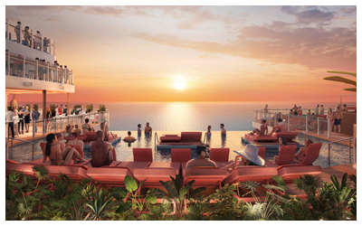 - The Hideaway: Located 135 feet above the ocean is the first suspended infinity pool at sea, which is the centerpiece to this unique, adults-only neighborhood. Other features include a multilevel sun terrace with whirlpools and a bar.