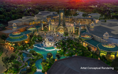 Serving as the epicenter for Epic Universe, Celestial Park is a thrilling journey through the cosmos. Guests will begin their Epic Universe adventure by entering an oasis of stunning waterfalls and immaculately landscaped gardens. Here guests will find Stardust Racers, an exciting new dual-launch racing coaster reaching speeds of up to 62 mph and heights of up to 133 feet. This thrilling attraction really comes to life after sunset when the illuminated ride vehicles streak through the night sky like blazing comets. In addition to several unique shopping opportunities, Celestial Park is home to two full-service restaurants. Atlantic offers an undersea culinary experience where guests can indulge in exceptionally prepared steak and seafood (including sea bass). The Blue Dragon Pan-Asian Restaurant allows guests to traverse Asia on a culinary expedition where they’ll enjoy such comfort foods as Tonkotsu Ramen and potstickers. Celestial Park is also home to several quick-service restaurants serving theme park staples such as pizza, hot dogs, and ice cream.