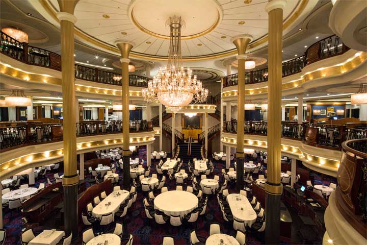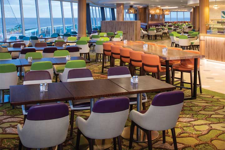 Main Dining Room: Sweeping, multi-level ambience, world-class cuisine and extraordinary personal service from a dedicated wait staff. Royal Caribbean’s main dining room serves exceptional, multi-course meals for breakfast, lunch and dinner.