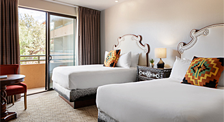 The Suncatcher Traditional Room features sliding doors to a juliet balcony, patio or courtyard terrace. Each room has a walk-in shower, 55" HDTV with streaming capabilities and other amenities such as bathrobes, signature bath amenities, a mini-fridge, coffee maker and in-room safe.