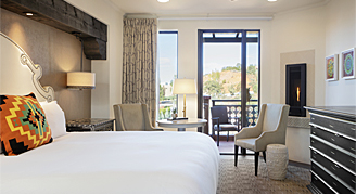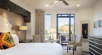 The Grove Room includes a fire feature and sliding doors to a walk out patio or balconette overlooking the Grove Gardens. Each room has a walk-in shower, 55" HDTV with streaming capabilities and other amenities such as bathrobes, signature bath amenities, refrigerator, coffee maker and in-room safe.