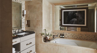 Classic Suites are comprised of a spacious sitting area, dedicated dressing room, writer’s desk, onyx marble-clad bathroom with soaking tub, and a French balcony that brings in fresh air and California sunshine. Accessible features consist of lowered light switches, a lowered vanity and mirror, roll-in shower with handheld shower head, grab bars near the shower and toilet, a phone with flashing light, and a visual alarm.