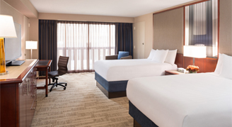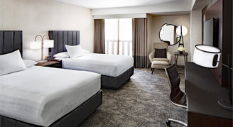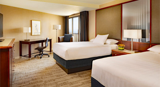 Rooms feature two double beds, an accessible tub, floor-to-ceiling windows and a large work desk.