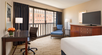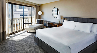 Rooms feature one king bed, an accessible tub, floor-to-ceiling windows and a large work desk.