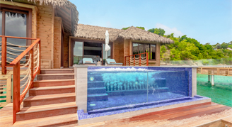 These adults-only bungalows feature a view of the ocean with a master bedroom, dining room and a private infinity plunge pool.