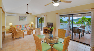 Rooms are located in The Village and feature two downstairs bedrooms, a queen-size sofa bed, and a full kitchen. Additional amenities include a TV, private outdoor seating area with chaise lounges and a dining table.