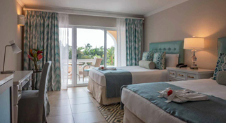Luxury Ocean-View Rooms are located in an elevated four-story building. These rooms feature two queen beds as well as a writing desk, arm chair and chaise lounge, all in classic island style.