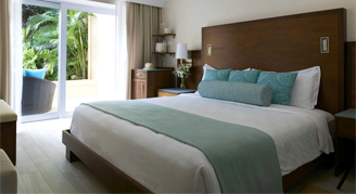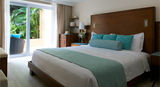Luxury Ocean-View Rooms are located in an elevated four-story building. These rooms feature a king-size bed as well as a writing desk, arm chair and chaise lounge, all in classic island style.