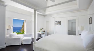 Room features ocean and piton views, a king size four-poster bed, full kitchen, large bathroom with coral detailing and walk in shower, private patio with walled garden, and infinity-edge pool.