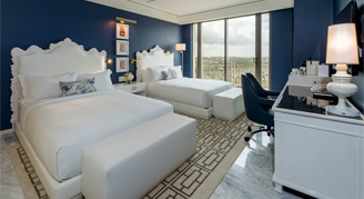 Rooms provide floor-to-ceiling windows with fountain views, and are located in the East Tower and West Tower. Room color may vary.