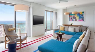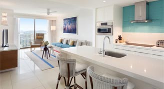 Rooms include a full kitchen, washer/dryer, a view of the ocean, and are located in the West Tower.