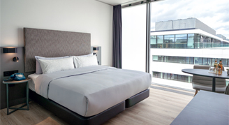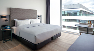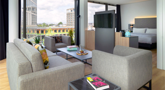 A modern suite that provides you with everything you need: Modern loft-style suite with king-size bed, living area, bathtub and rain shower, coffee maker, and yoga mat – your private retreat in the city. A rollaway bed is available on request for this room (fee may apply).