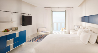 These rooms include spacious private terraces that come complete with an outdoor heated Jacuzzi. Views offer stunning vistas of the Aegean Sea.