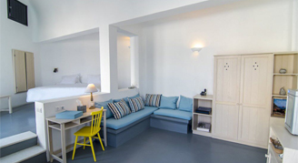 This suite blends traditional Cycladic architecture with modern elegance, offering a private balcony, a private pool, a gazebo, and daybeds, creating a cozy yet sophisticated retreat.