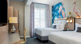 Located on floors 2 - 7, this room has two queen beds, expansive beach and Gulf of Mexico views, premium Wi-Fi, and an efficient work desk.