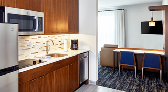 The Residence Inn features spacious, apartment inspired suites equipped with kitchens, queen size sofa sleepers, 55” flat screen TVS, and plush king beds.