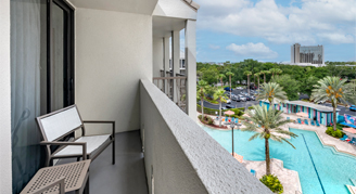 Rooms feature views of the hotel’s pool.