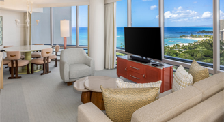These newly renovated suites feature views of the Pacific Ocean from floors 24 to 34. These luxury suites include a private lanai and gourmet kitchen.