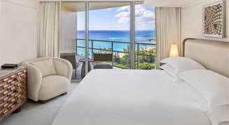 These newly renovated rooms feature views of Waikiki and the Pacific Ocean on floors 16 to 23.