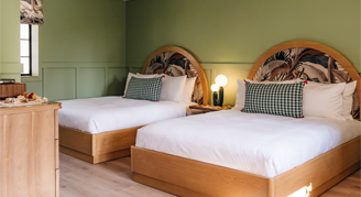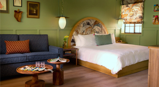 Dive into this studio room with a king bed or two queen beds, featuring a pull-out sofa bed, wet bar and additional amenities: coffee maker, record player and more. Pool house rooms feature views of our 70' salt water pool. Also included are thoughtful touches such as Bluetooth speaker, wall hooks, robes and Grown Alchemist bath products.