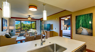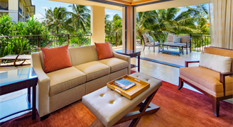 One, two and three-bedroom villas offer full gourmet kitchens, lanais with floor-to-ceiling sliding glass doors, semi-private elevator access, private 5-piece bathrooms for every bedroom, in-suite washer and dryer, high-speed wireless internet, 42" LCD TV's and multi-bedroom floor plans. Studios offer cooktop, microwave, compact refrigerator, and coffee maker.