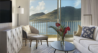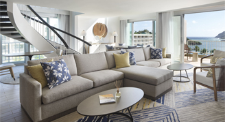 The largest option for accommodations. This two-level suite, with the bedroom on the second floor, overlooks the Pacific Ocean and includes a walk-in shower, soaking tub, refrigerator, and clothing steamer. The living areas feature a wet bar and kitchenette.