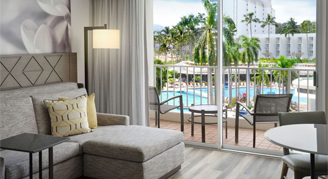 Rooms feature views of the resort's 26,000-square-foot pool.