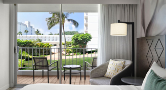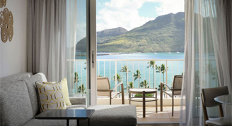 Rooms feature a view of the Pacific Ocean from the balcony.