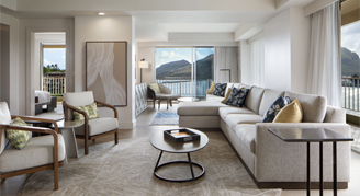 This suite features two balconies and extended living and dining areas with views of the Pacific Ocean. Additional amenities include a walk-in shower, soaking tub, refrigerator, and clothing steamer.