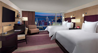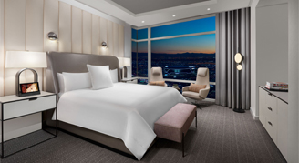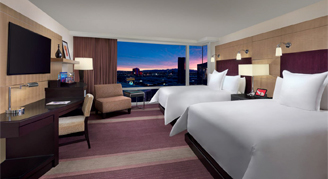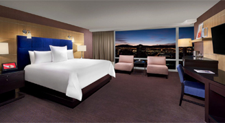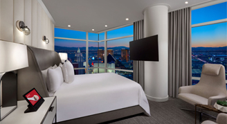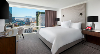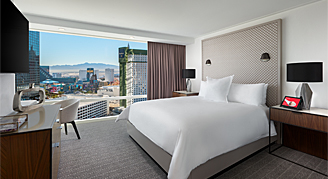 Rooms feature spectacular views of the Las Vegas Strip, a 42-inch HD LCD TV, spa-style bathroom with shower, soaking tub, and a 10-inch touch-screen control panel for room settings.