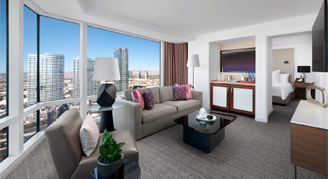 Rooms feature panoramic views of the Las Vegas skyline, a custom mattress, 300-thread count linens, three LCD HD TVs, a separate living room, and a bathroom with a whirlpool tub.
