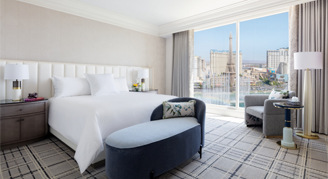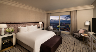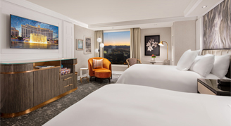 Experience unparalleled luxury with stunning views of the iconic Las Vegas Strip. This room proudly combines elegance and comfort with a plush Premium Mattress crafted exclusively for Bellagio, sophisticated décor, and modern amenities. The marble bathroom boasts an oversized shower in neutral tones and luxurious finishes inspired by Lake Como in Italy.