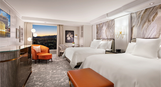 Step into a private oasis that offers ample space and luxurious comforts to enhance your stay. This room is inspired by the mesmerizing sunset over Lake Como in Italy, the décor is tied to rich, earthy tones that soothe and calm guests after a long day. Featuring two plush queen beds, and a well-designed marble bathroom, this room offers a serene retreat in the heart of The Strip.