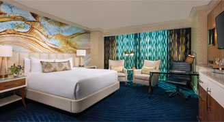 This suite features natural tones of aquatic blues accented with lively hints of green for a stylish play on serenity and energy combined. One deluxe King Bed wrapped in smooth linen centers this naturally inviting space. Ample work space and an extended area with seating for four allow business and pleasure to live in harmony in this Las Vegas Suite. This room is ideally designed for well-earned relaxation.