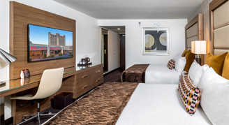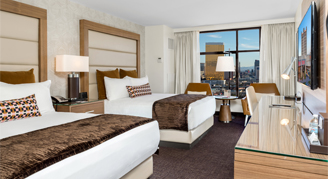 Guest room features two queen beds with pillow top mattresses, spacious work area, sitting area for two and a 55" Flat Screen TV. The granite bathroom includes an over-sized vanity and shower. Additional conveniences include built-in headboard reading lamps, electronic safe, USB charging outlets and an iHome Bluetooth stereo.