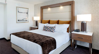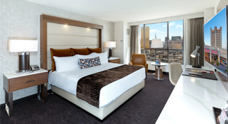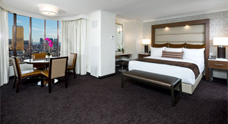 Guest room features one king bed with a pillow top mattress, views of the city, sitting area for two, spacious work area and a 55" Flat Screen TV. The granite bathroom includes an over-sized vanity and shower. Additional conveniences include built-in headboard reading lamps, electronic safe, USB charging outlets and an iHome Bluetooth stereo.