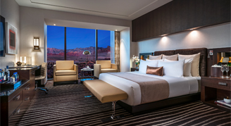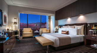 Room features one king size double pillow top plush bed, plush down duvet and pillows, 320-thread count Egyptian cotton linens. Views of the Las Vegas Strip. 65-inch ultra-high-definition TV and lounging area. Executive work desk with high-speed Wi-Fi available. iHome Bluetooth alarm clock with Qi wireless charging and in room laptop safe. Bathrooms feature Calcutta marble deep soaking tub, separate showers, lighted makeup mirrors, dual sinks and a plush Red Rock embroidered robe.