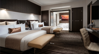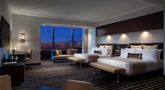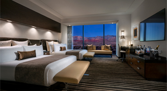 Room features two queen size double pillow top plush beds, plush down duvet and pillows, 320-thread count Egyptian cotton linens. Views of the Las Vegas Strip. 65-inch ultra-high-definition TV and lounging area. Executive work desk with high-speed Wi-Fi available. iHome Bluetooth alarm clock with Qi wireless charging and in room laptop safe. Bathrooms feature Calcutta marble deep soaking tub, separate showers, lighted makeup mirrors, dual sinks and a plush Red Rock embroidered robe.