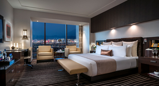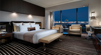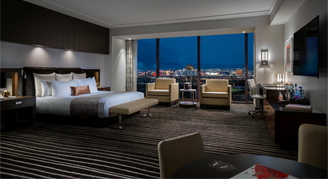 Room features one king size double pillow top plush bed, plush down duvet and pillows, 320-thread count Egyptian cotton linens. 65-inch ultra-high-definition TV and lounging area. Executive work desk with high-speed Wi-Fi available. iHome Bluetooth alarm clock with Qi wireless charging and in room laptop safe. Bathrooms feature Calcutta marble deep soaking tub, separate showers, lighted makeup mirrors, dual sinks and a plush Red Rock embroidered robe.