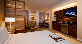 For a truly unique Vegas experience, this 550-square foot suite boasts gorgeous views from the private balcony. Each suite includes a dedicated sitting area, kitchenette, spacious bedroom with king-sized bed, 42-inch HD TV and a whirlpool spa tub.