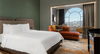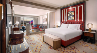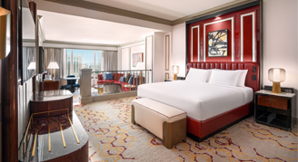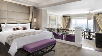 Nearly double the size of standard rooms offered on the Las Vegas Strip, this suite comes complete with one pillow-top king bed. Relax or entertain in your sunken living room. With a Roman tub and a separate glass-enclosed shower, a tranquil soak is never far away. Getting ready is easy with a makeup mirror and vanity. Choose to stay in and order from the in-suite dining menu to enjoy at your dining table. Upgrade to some of the most captivating views of the Las Vegas Strip. Delight in the amazing lights and visual excitement while enjoying the serene luxury of spacious suites. See the excitement for yourself!