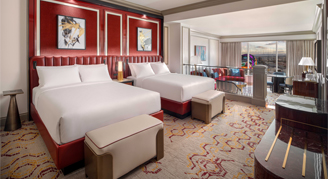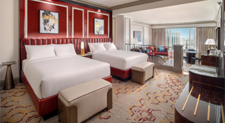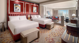 Featuring a contemporary, fresh design inspired by the traditional ornate costumes of the Venetian Carnival, this newly remodeled suite offers a full view of the new Sphere and comes complete with two pillow-top queen beds, a sunken living room, a complimentary guest mini-fridge and a dining table for your in-suite dining indulgences. Unwind as you relax in the all-marble expansive bathroom that features an oversized Roman tub, a separate glass-enclosed shower, a double-sink vanity along with a separate make-up mirror and vanity.