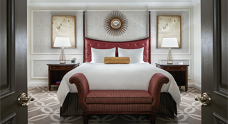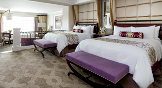 Featuring a contemporary, fresh design inspired by the traditional ornate costumes of the Venetian Carnival, this newly remodeled suite comes complete with two pillow-top queen beds, a sunken living room, a complimentary guest mini-fridge and a dining table for your in-suite dining indulgences. Unwind as you relax in the all-marble expansive bathroom that features an oversized Roman tub, a separate glass-enclosed shower, a double-sink vanity along with a separate make-up mirror and vanity.