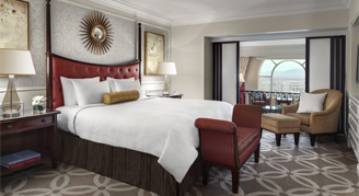 Suites are generally located on lower floors with an obstructed view that may overlook rooftops, surrounding buildings or similar. Features include a double-door entrance into an Italian marble foyer, a master bedroom with king-size bed and Egyptian cotton sheets, and a jetted tub with separate glass-enclosed shower. A sunken living room offers a wet bar, formal dining table and sofa bed for an extra sleeping area. One-and-a-half baths with a powder room are off the entryway, and the 170-square-foot bathroom features a jetted tub. Remote-controlled Roman shades and curtains offer a convenient way to maintain a darkened suite.