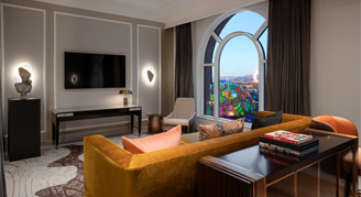 Featuring a contemporary, fresh design inspired by the traditional ornate costumes of the Venetian Carnival, this newly remodeled suite offers a full view of the new Sphere and comes complete with a pillow-top king bed, a sunken living room, a complimentary guest mini-fridge and a dining table for your in-suite dining indulgences. Unwind as you relax in the all-marble expansive bathroom that features an oversized Roman tub, a separate glass-enclosed shower, a double-sink vanity along with a separate make-up mirror and vanity.