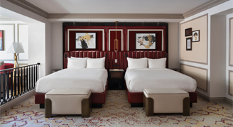 Suites are generally located on lower floors with an obstructed view that may overlook rooftops, surrounding buildings or similar. The double-door entrance opens into an Italian marble foyer. Suites feature two queen-size pillow top plush beds with Egyptian cotton sheets and a spacious walk-in closet; and a separate sunken living room with a dining table for three and a sofa bed. The 130-square-foot all-marble bathroom offers a Roman tub, separate shower and vanity with mirror. A working area, dual-line phone, and wireless internet access are also included. Remote-controlled Roman shades and curtains offer a convenient way to maintain a darkened suite.